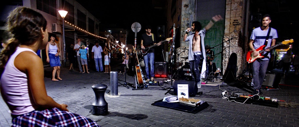 Hóra az egyik sarkon, jazz a másikon. Egy terecskén pedig együtt énekeljük a zenekarral a Free slágerét: „All right now, baby, it’s all right now.” Na ez biztos! A tűzzsonglőrökről lemaradok – már pakolnak – és a piac melletti design kiállítás megnyitójáról is. Viszont belefutok a Buckets and Joints koncertjébe. Lendületes garázsrock, bármelyik rock-csarnok, vagy klub többszázas népét elragadná. Itt a fiúk az Old Jaffo Hostel erkélyei alatt 50-100 arra járónak játszanak. De úgy odateszik magukat, mintha a Wembleyben nyomnák. Van is siker! Hullik a sékel a kalapba, fogy a cd. Hiszek a helyek szellemében! Ebben a hostelben laktunk első izraeli turista utunk idején. Megszerettük és most idehozza a véletlen a Fehér Éjszaka, szerintem legjobb buliját. De ezt csak később döntöttem el, mikor reggel a fotókat leltároztam.